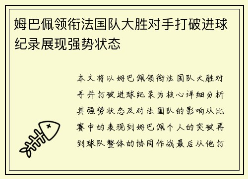 姆巴佩,这位足球场上的年轻巨星,凭借其卓越的个人能力和拼搏精神,在最近的比赛中闪耀全场,带领巴黎圣日耳曼赢得重要的胜利。尽管巴黎的整体表现一直备受关注,但此次比赛中,姆巴佩的出色表现无疑成了焦点。他的速度、技术、决策和进攻威胁,再次证明了他是世界足坛最顶尖的球员之一。本文将从四个方面详细探讨姆巴佩如何凭借个人能力助巴黎赢得胜利,并锁定欧洲金靴奖作为目标:一是姆巴佩的个人技术,二是他在比赛中的进攻组...