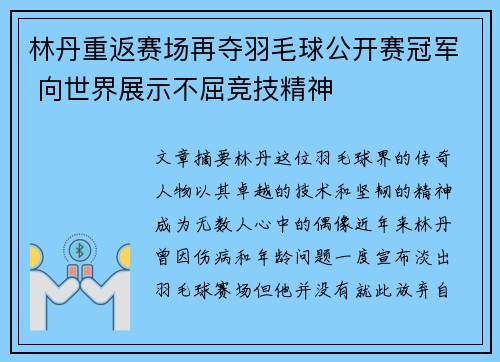 林丹,作为中国羽毛球的传奇人物,一直以来都承载着无数羽毛球爱好者的梦想与希望。他的退役,意味着羽毛球界的一代巨星的告别,也象征着一个时代的结束。2025年,林丹宣布正式退役后首次公开亮相,带来了他退役背后的心路历程以及对未来的规划。在这次公开亮相中,林丹不仅回顾了自己辉煌的羽毛球生涯,还深入剖析了决定退役的原因,并且为未来的职业生涯进行了深刻的规划。这篇文章将围绕林丹退役后的首次亮相,详细探讨他退...